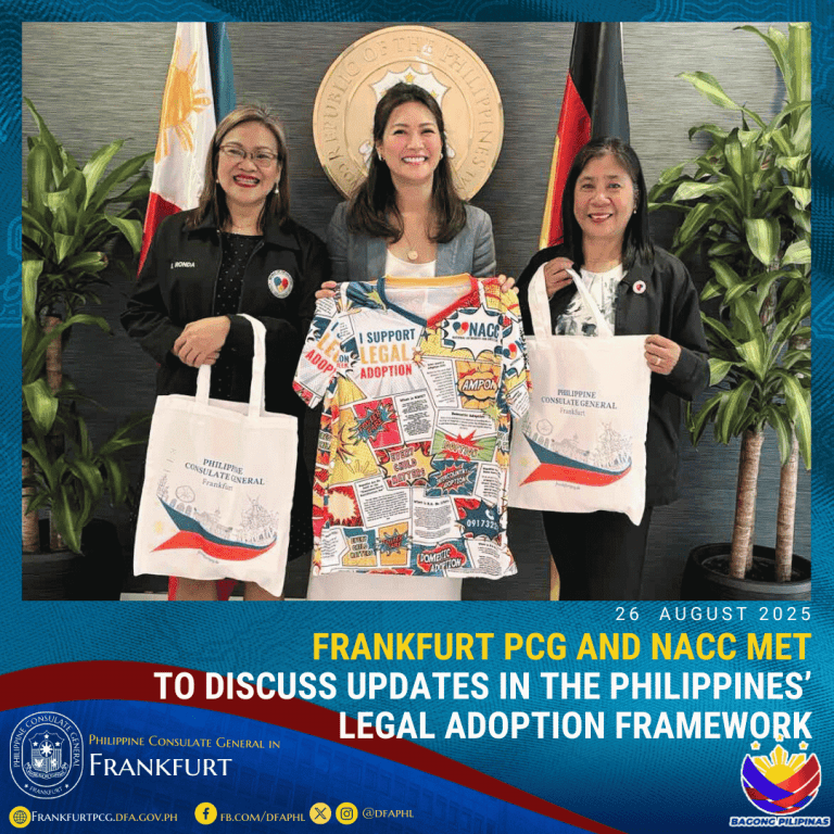 26 August 2025 – The Philippine Consulate General in Frankfurt welcomed delegates from the National Authority for Child Care (NACC), Director Imelda Ronda and Council Member Meluya Reluya to discuss updates in the Philippine legal adoption framework and the NACC’s work.